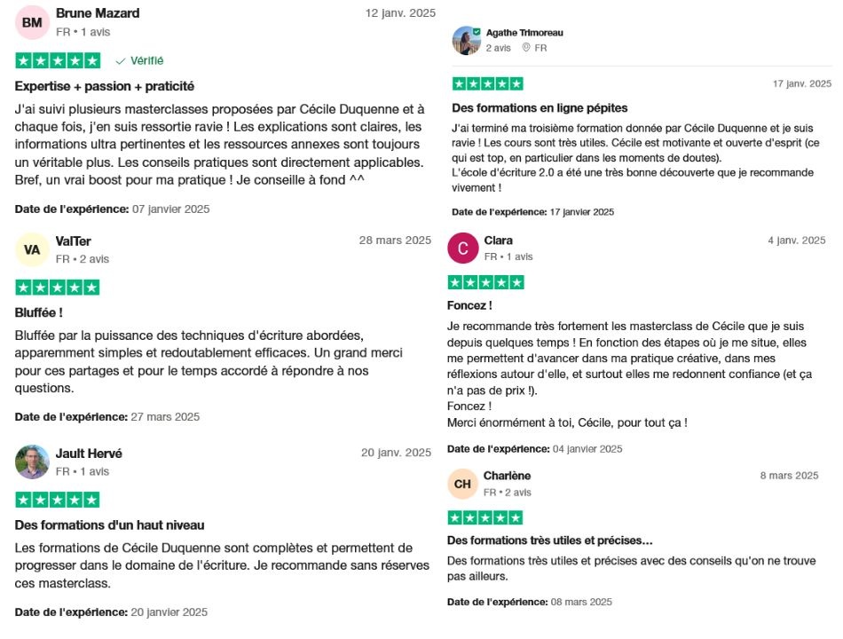 Cette méthode, je l’ai enseignée à +7450 auteurs, qui ont eux aussi pu préparer leur projet sereinement, entamer l’écriture l’esprit léger, et parvenir jusqu’au mot fin en étant fier et heureux du résultat.