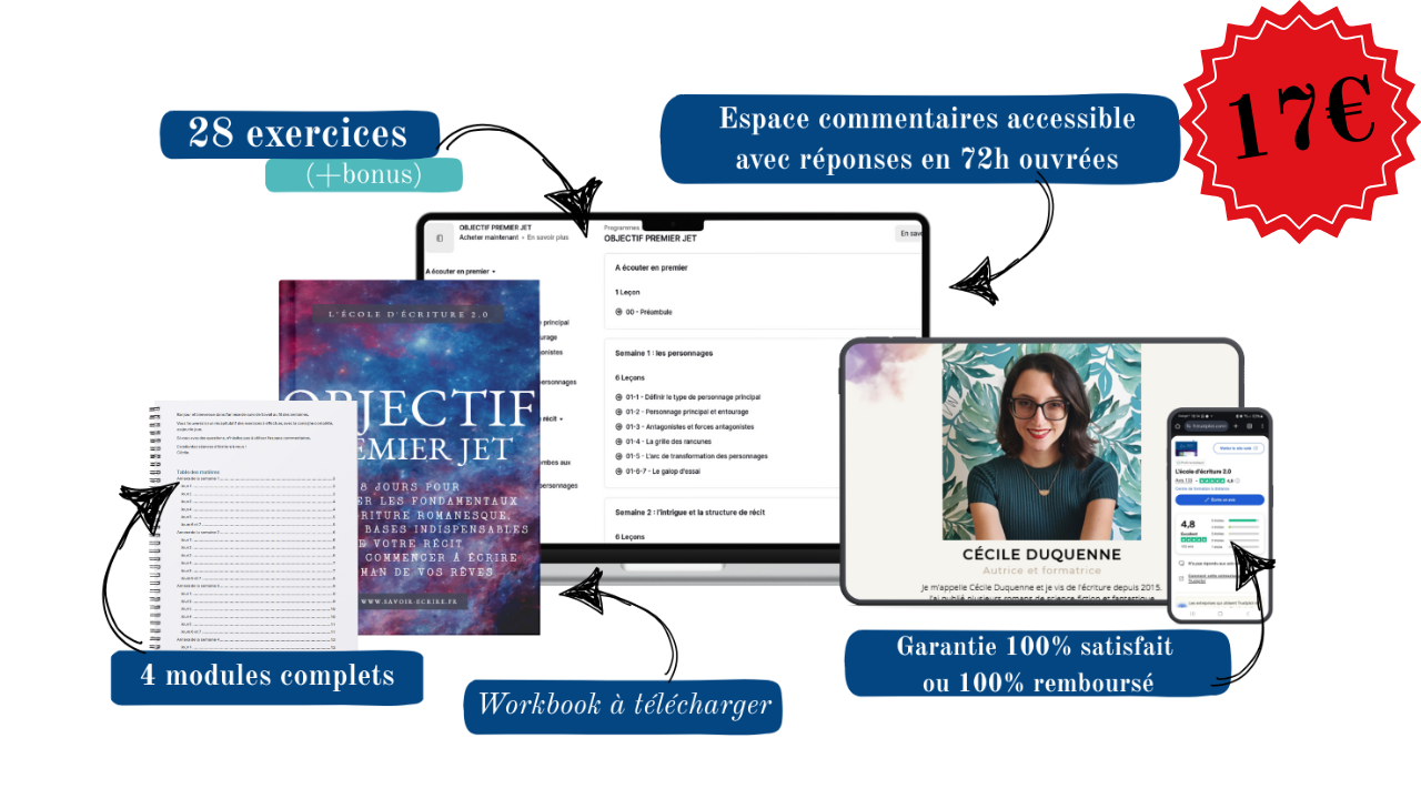 OBJECTIF PREMIER JET est la méthode parfait(e) si vous voulez mieux comprendre les rouages de l’écriture romanesque, réussir à concrétiser votre rêve d’écriture, et vous lancer enfin dans l’écriture de ce roman qui vous hante depuis si longtemps, sans trahir qui vous êtes en formatant votre récit jusqu’à ne plus le reconnaître.